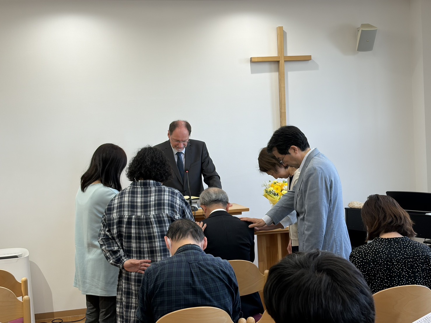 4月19日、当教会の開拓伝道を行ったベック宣教師により、4月から協力牧師となった金子昭彦師のための牧師就任祈祷が、礼拝の中で捧げられました。主の助けと導き、祝福のためにお祈りしてくださいました。感謝